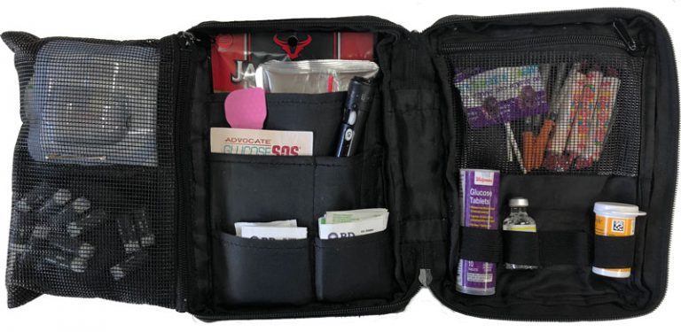 Whenever the kids have a holiday break from school, I deep-clean their lunch bags, backpacks, snack containers and the diabetes bag (D-bag). Our go-to bag and a list of all items in the bag.